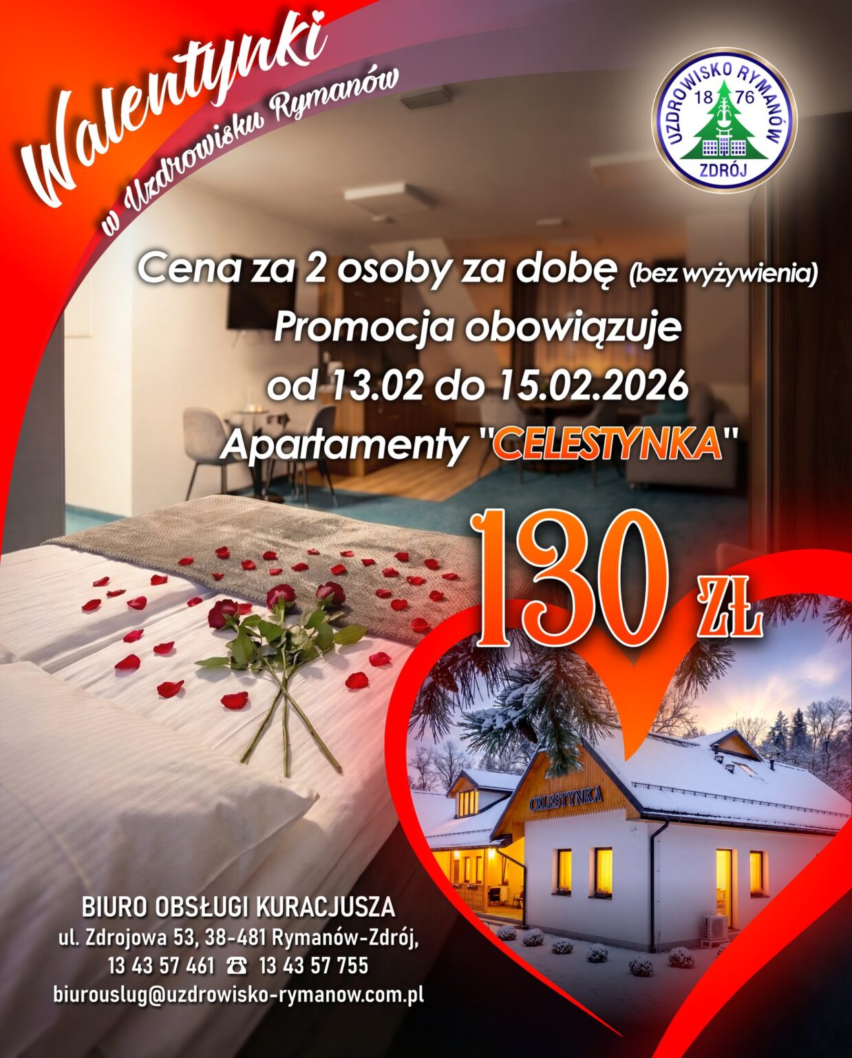 Zapraszamy na wyjątkowy pobyt walentynkowy w Apartamentach Celestynka Oferta specjalna: 130 zł za dwie osoby / 1 doba Termin: 13–15 lutego 2026 Liczba apartamentów jest