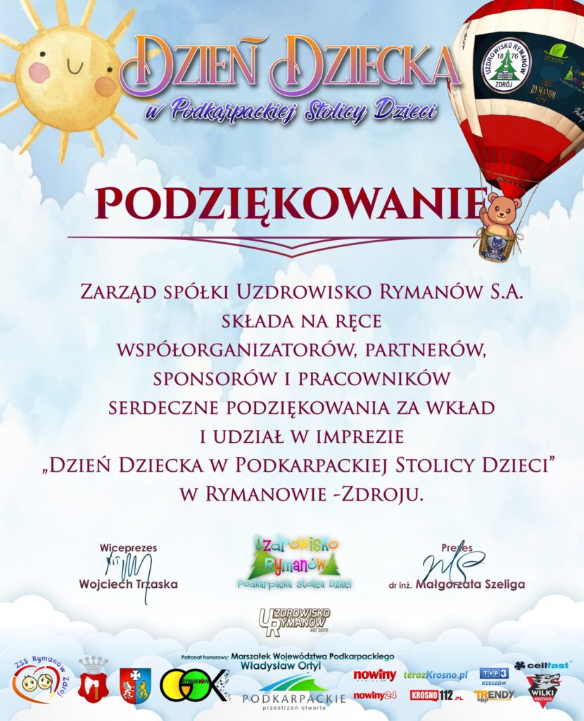 Zarząd Uzdrowiska Rymanów S.A. – dr inż. Małgorzata Szeliga Prezes Zarządu, oraz Wojciech Trzaska Wiceprezes Zarządu, składa serdeczne podziękowania na ręce wszystkich Sponsorów i Partnerów za okazane wsparcie i zaangażowanie w organizację Dnia Dziecka w Rymanowie-Zdroju – Podkarpackiej Stolicy Dzieci.