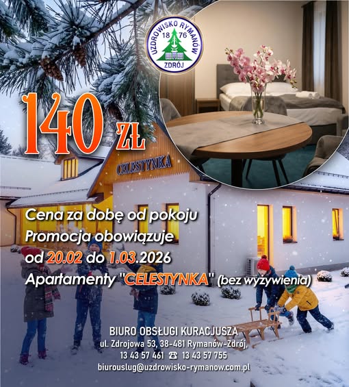 W Apartamentach Celestynka przygotowaliśmy specjalną ofertę na zakończenie zimowego wypoczynku. Od 20 lutego do 1 marca zapraszamy na pobyty w wyjątkowej cenie – tylko 140 zł za dobę za cały apartament!