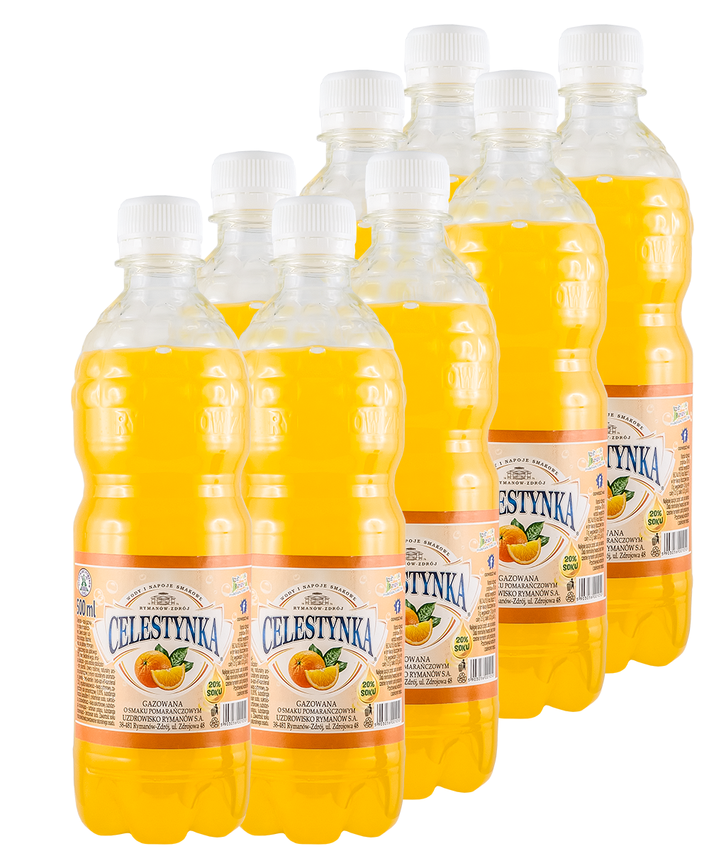 Celestynka – napój gazowany o smaku pomarańczowym – butelka PET 0,5 L. Zawiera cukier i substancje słodzące. Składniki: woda, sok jabłkowy otrzymany z zagęszczonego soku jabłkowego (20%), cukier, dwutlenek węgla, emulsja (stabilizator – guma arabska, stabilizator – estry glicerolu i żywicy roślinnej, naturalny aromat pomarańczowy z innymi naturalnymi aromatami, barwniki – beta-karoten i beta-apo-8′-karotenal (C30)), regulator kwasowości – kwas cytrynowy, zagęszczony sok pomarańczowy 0,05%, substancja słodząca (acesulfam K, cyklaminian sodu, sukraloza), przeciwutleniacz – kwas askorbinowy, substancja konserwująca – sorbinian potasu, substancja konserwująca – benzoesan sodu.