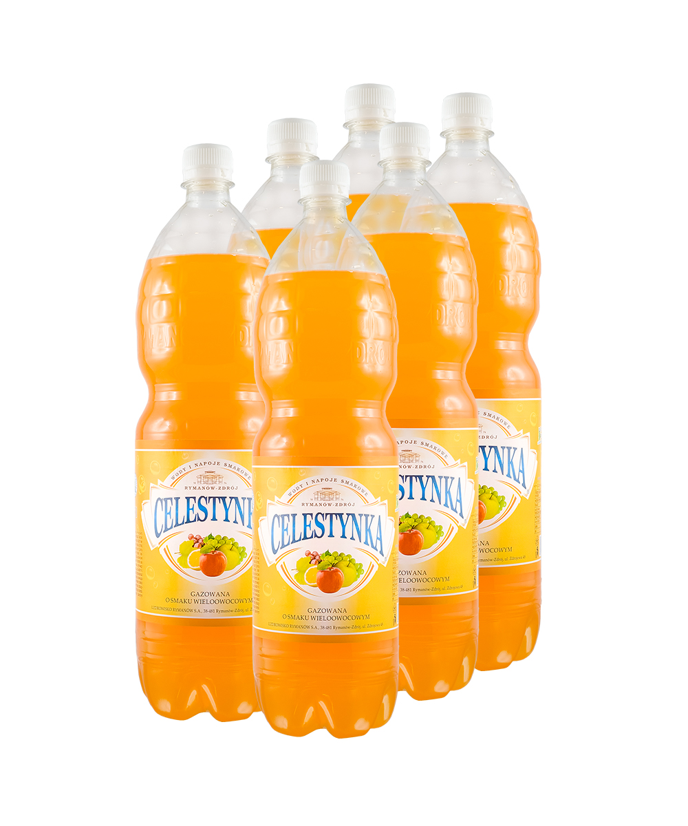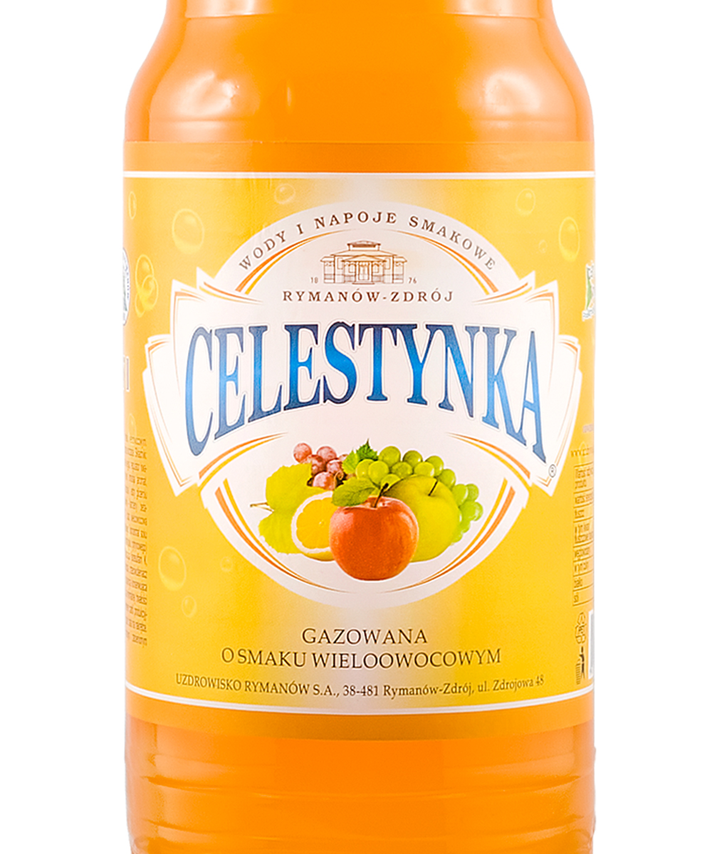 Celestynka – napój gazowany o smaku wieloowocowym – butelka PET 1,5 L. Zawiera cukier i substancje słodzące. Składniki: woda, sok jabłkowy otrzymany z zagęszczonego soku jabłkowego (20%), cukier, dwutlenek węgla, regulator kwasowości – kwas cytrynowy, emulsja (aromat, stabilizatory – guma arabska i estry glicerolu i żywicy roślinnej, barwniki – beta-apo-8’-karotenal (C30) i karoteny), baza wieloowocowa (koncentrat soku jabłkowego, koncentrat soku winogronowego, koncentrat soku cytrynowego) – 0,05%, substancja słodząca (acesulfam K, cyklaminian sodu, sukraloza), przeciwutleniacz – kwas askorbinowy, substancja konserwująca – sorbinian potasu, substancja konserwująca – benzoesan sodu.