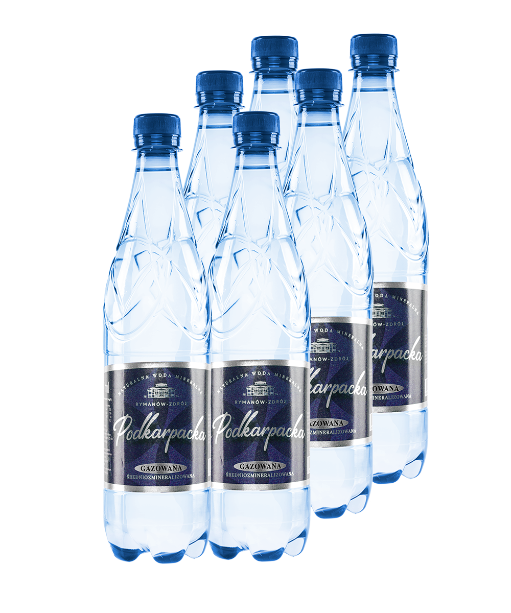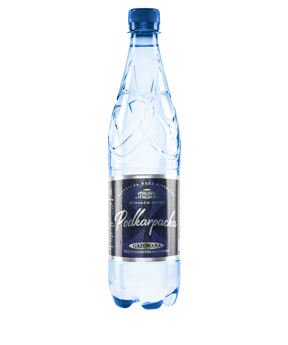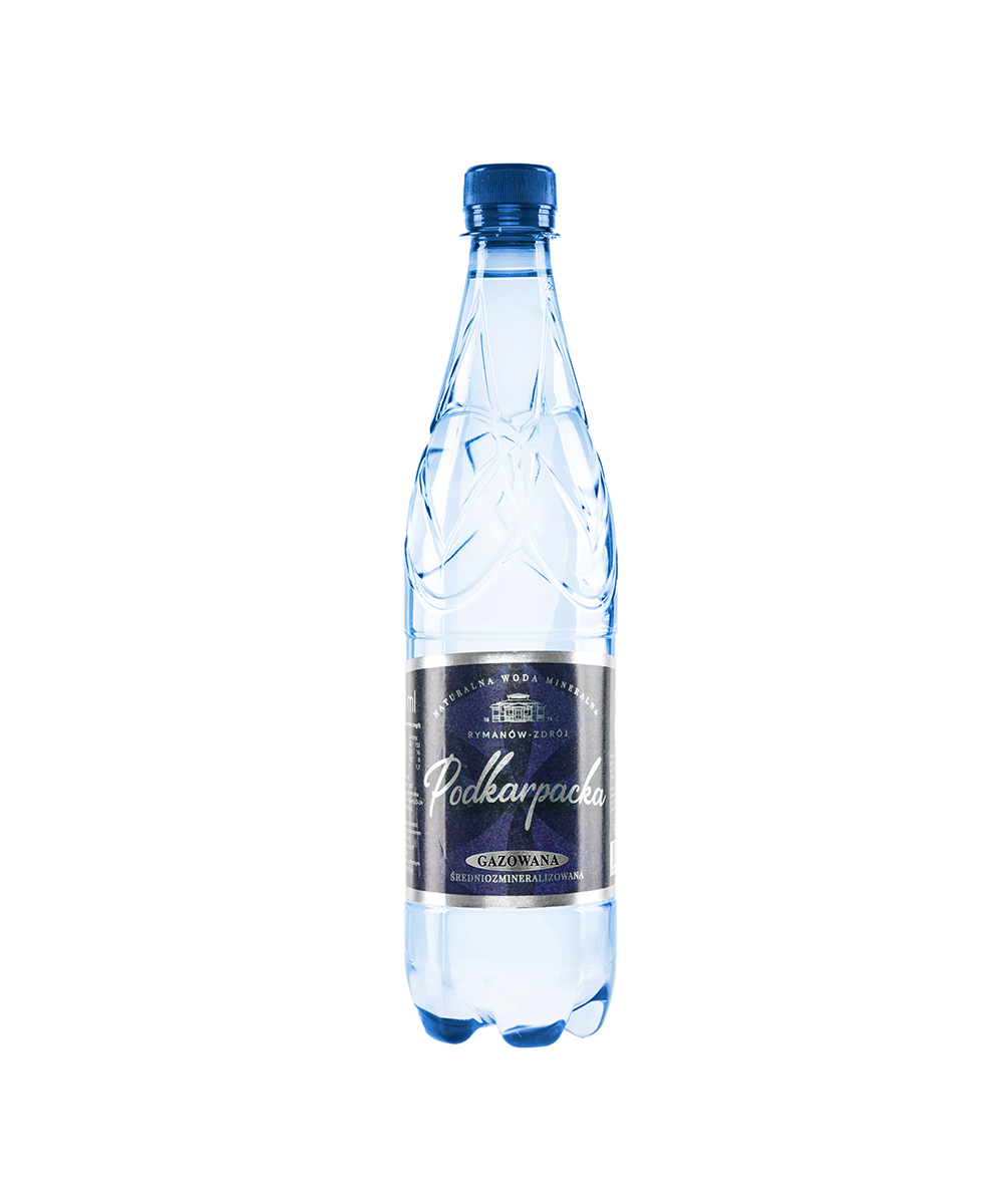 Podkarpacka – woda mineralna gazowana – butelka PET 0,7 L. Ogólna zawartość składników: 691 mg/l. Naturalna woda mineralna wydobywana z odwiertu D-2A w Rymanowie Zdroju, wysokonasycona dwutlenkiem węgla, filtrowana.