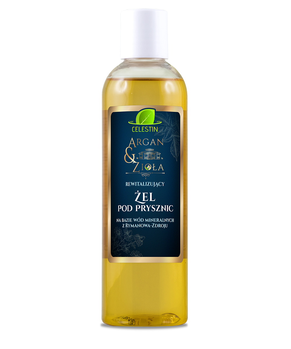 Rewitalizujący żel pod prysznic na bazie wód mineralnych z Rymanowa Zdroju, z dodatkiem olejku arganowego z EcoCertem, wzbogacony wyciągiem z polskich ziół (rumianek – działanie kojące, łagodzące podrażnienia, nagietek- działanie przeciwzapalne, pokrzywa – działanie wzmacniające, wyciąg z siemienia lnianego- działanie osłaniające, zmiękczające skórę, nadaje jej gładkość i delikatny zapach).